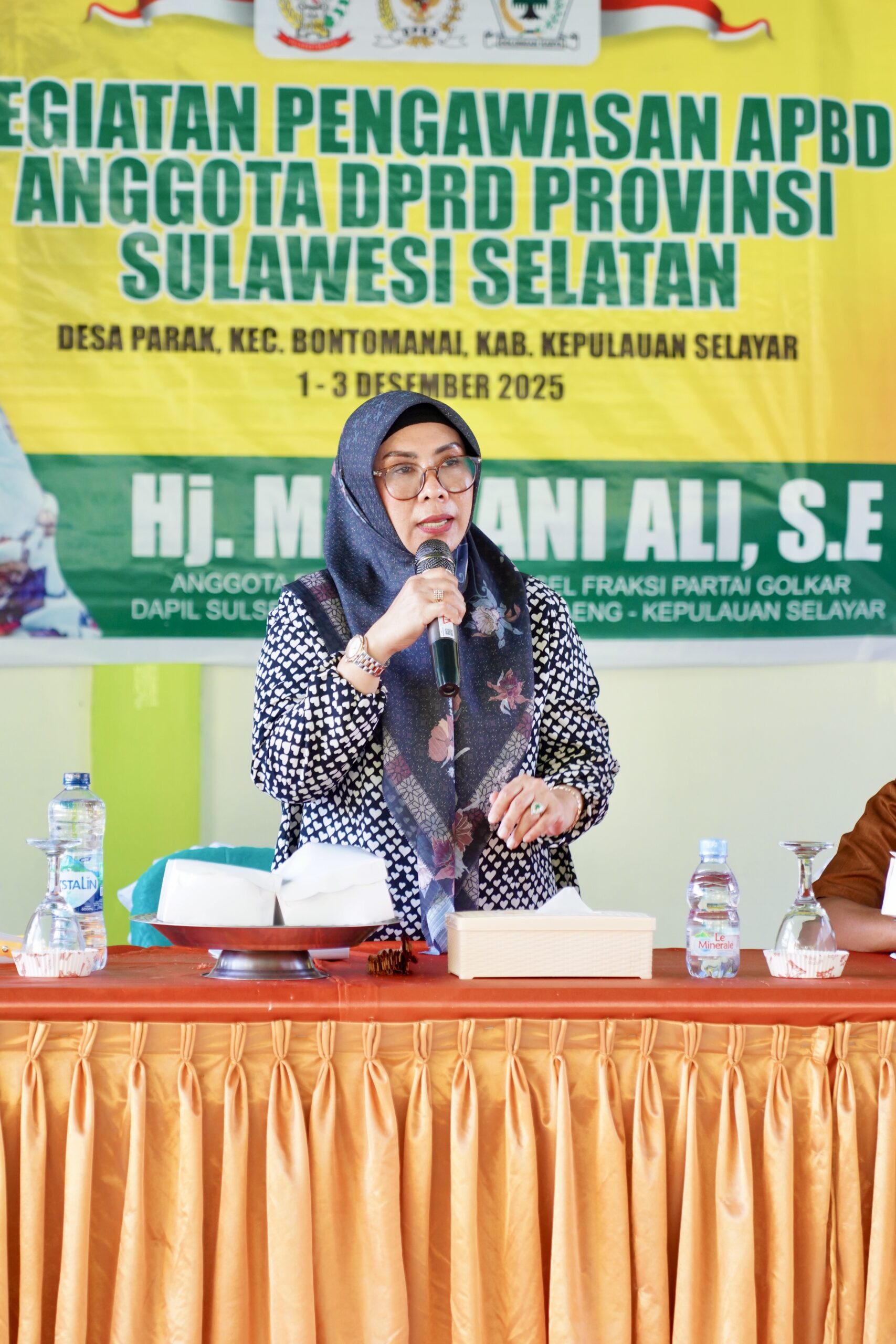 Selayar — Anggota DPRD Provinsi Sulawesi Selatan, Hj. Maryani Ali, SE, melaksanakan kegiatan pengawasan di Desa Bontotanga, Kecamatan Bontoharu, Kabupaten Kepulauan Selayar, selama tiga hari berturut-turut, mulai 1–3 Desember 2025. Kegiatan ini menjadi bagian dari upaya memastikan program-program pemerintah daerah berjalan efektif dan tepat sasaran.
