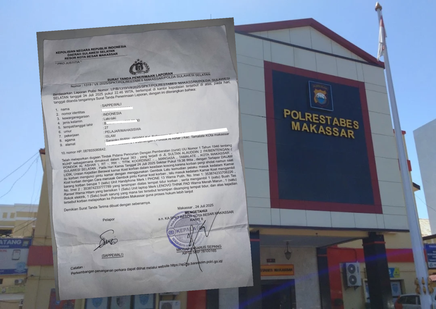 Dalam laporan itu, Sappewali melaporkan peristiwa pencurian yang terjadi di kosnya di Jalan Sultan Alauddin II, Pabentengan, Pondok Al Ashar, Tamalate, Makassar, pada Kamis malam, 24 Juli 2025 sekitar pukul 19.38 WITA. Saat kejadian, korban sedang tidak berada di tempat. Pelaku diduga masuk ke kamar kos dengan merusak gembok pintu dan kemudian mengambil sejumlah barang berharga milik korban. Barang yang hilang antara lain satu unit iPhone 13 warna putih, satu buah tas ransel hitam berisi laptop Lenovo ThinkPad warna merah marun, satu buah rokok elektrik, serta sejumlah uang tunai.